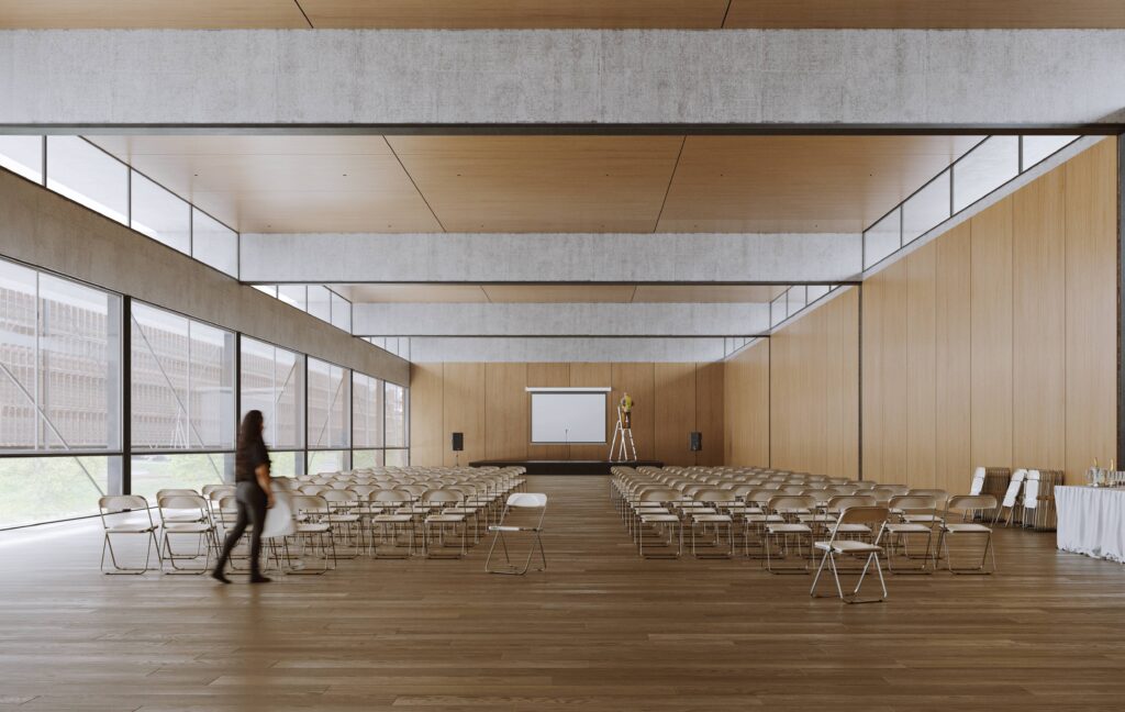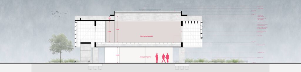 Como programa principal, el Centro de Convenciones se posiciona a 5 metros sobre el nivel de la vereda, priorizando las vistas al río Paraná y resolviendo el problema del confort térmico con el minucioso diseño de técnicas pasivas de acondicionamiento térmico y acústico. Con una altura de 6,40 metros, el espacio principal reúne todos los criterios bioclimáticos que aseguran el confort térmico de los usuarios.