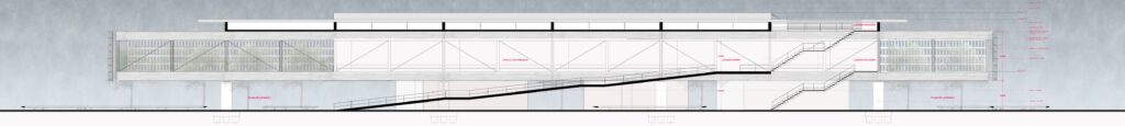 Las distancias de los ejes estructurales corresponde a la distribución más eficiente de los esfuerzos. Todos los elementos estructurales fueron sometidos a un pre-cálculo estructural y han sido diseñados según sus exigencias específicas. Es por eso que los elementos a la tracción se resuelven con varillas o perfiles de acero, los elementos a la flexión con hormigón armado, los montantes de las dos cerchas reticuladas principales con perfiles H, los pilares cilíndricos con hormigón armado y los anclajes metálicos con neopreno. Cada articulación de la estructura representa una transferencia de fuerzas que quedan plasmadas en el diseño de las piezas. Se podría decir que la síntesis del proyecto se resuelve con la estructura.
