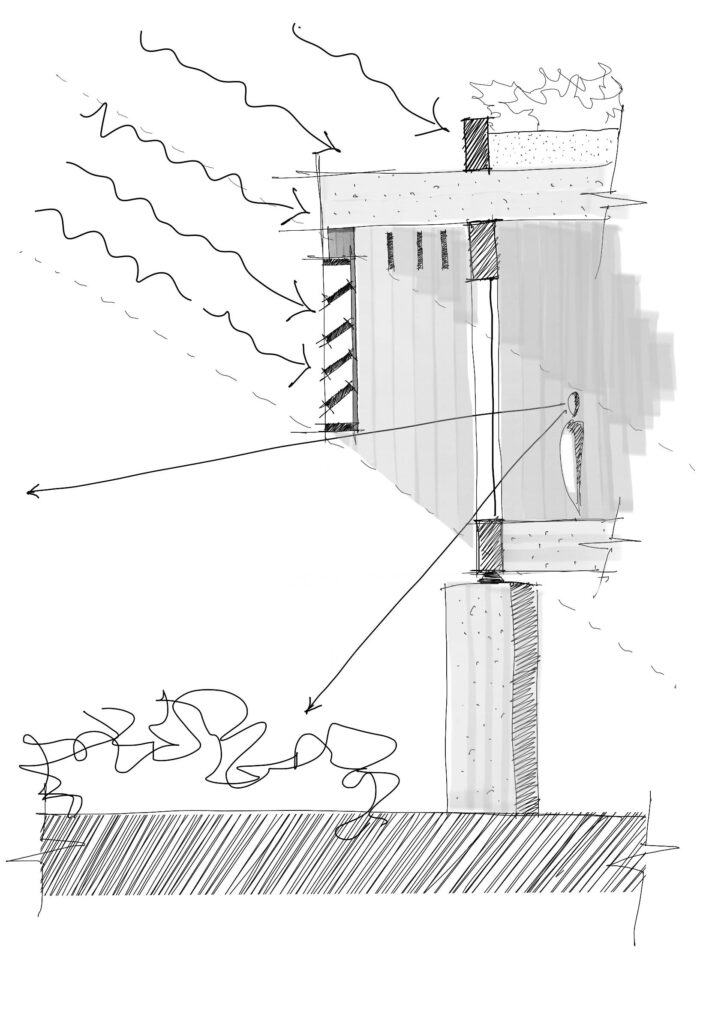 La ventilación cruzada se resuelve con aberturas de distinto tamaño enfrentadas y en alturas diferentes, propiciando el efecto Venturi y la correcta regulación de la humedad interior. El techo verde, ubicado encima del Centro de Convenciones, amortigua la transmisión de la radiación solar al interior del edificio, protegiendo al programa principal del 70% del calor generado por exposición. Los parasoles de ladrillos producen sombra en las caras este y oeste, sin bloquear las vistas desde el interior. Un criterio importante de destacar fue la diferencia de altura en el parasol que da al oeste para enmarcar la vista al paisaje desde el interior. La separación de los parasoles genera una cámara de aire que impide la transmisión de calor entre el exterior y el interior. Por último, el pergolado de hormigón entre el parasol cerámico y la línea de vidrio del Centro produce una sombra que protege al interior de la radiación directa.