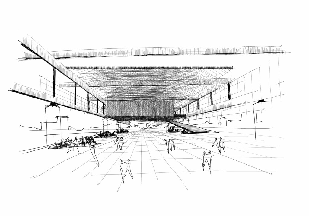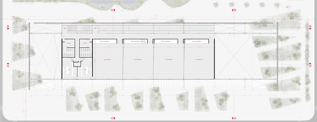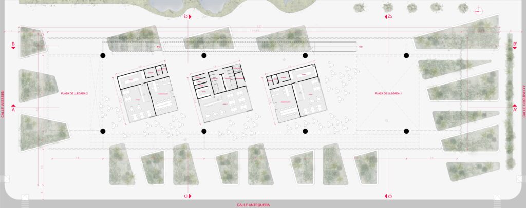 Las transiciones espaciales explican el dialogo urbano entre proyecto y su contexto inmediato. La arquitectura propuesta pretende resolver las transiciones de escala y las secuencias espaciales según el recorrido. En los dos extremos del edificio se encuentran plazas en triple altura que responden a la llegada del edificio y el remate de la cuadra. Son a la misma un foyer como un ágora o espacio de encuentro, de carácter público y de escala urbana. En los costados longitudinales este-oeste se ubican también triples alturas que sirven de amortiguamiento y transición entre la vereda y la calle peatonal. Las circulaciones verticales se implantan en el costado este del edificio.