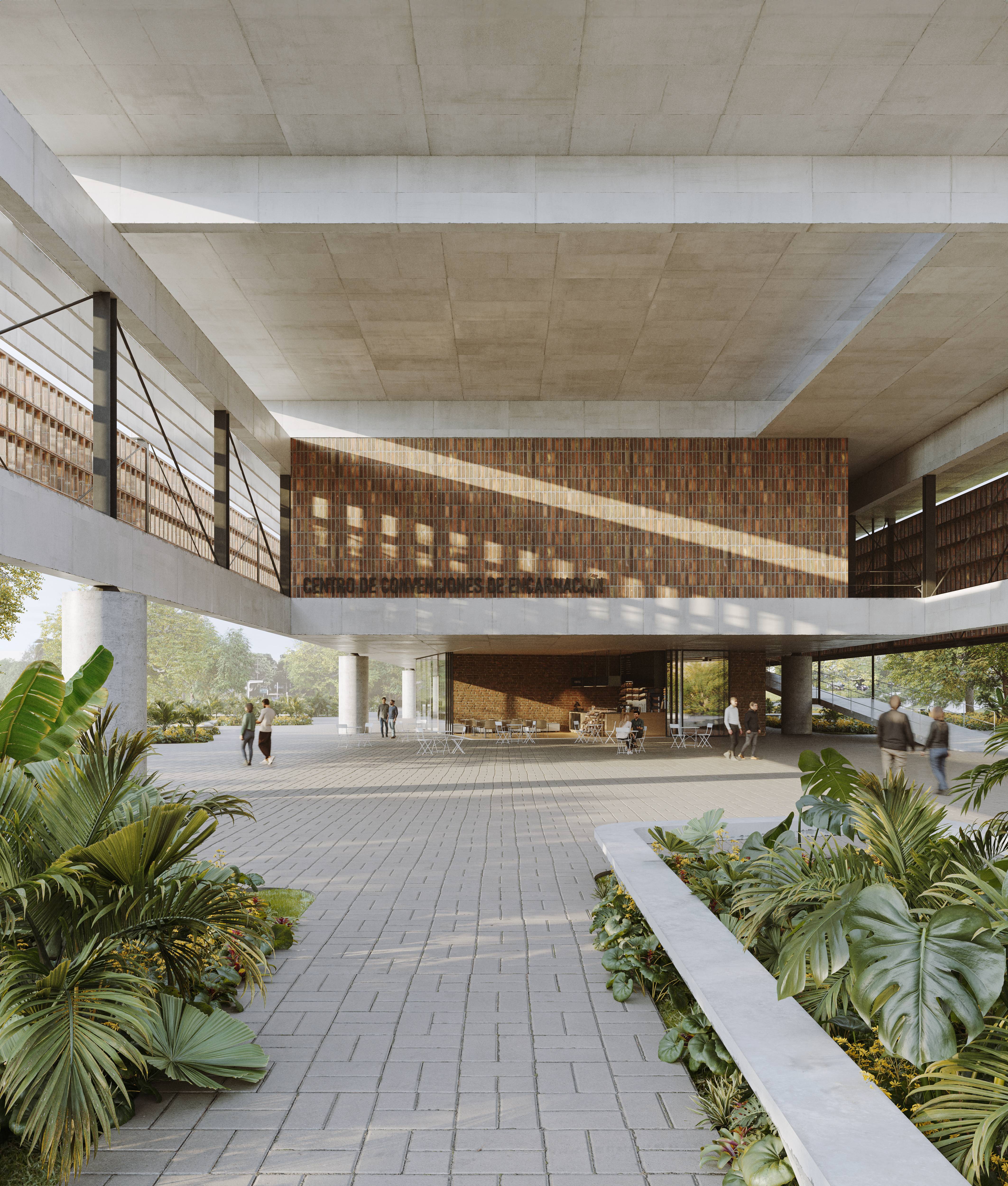 Como programa principal, el Centro de Convenciones se posiciona a 5 metros sobre el nivel de la vereda, priorizando las vistas al río Paraná y resolviendo el problema del confort térmico con el minucioso diseño de técnicas pasivas de acondicionamiento térmico y acústico. Con una altura de 6,40 metros, el espacio principal reúne todos los criterios bioclimáticos que aseguran el confort térmico de los usuarios.