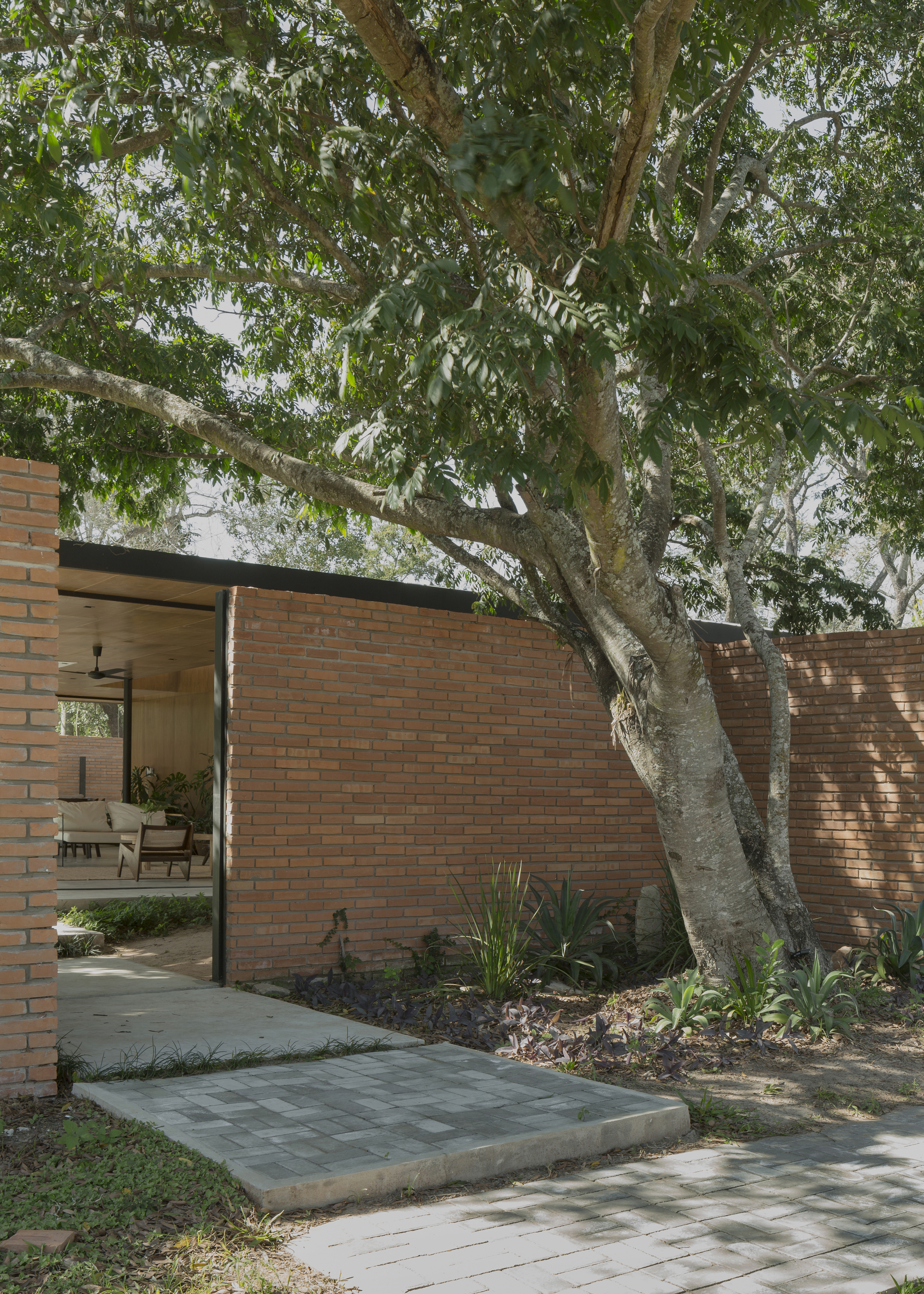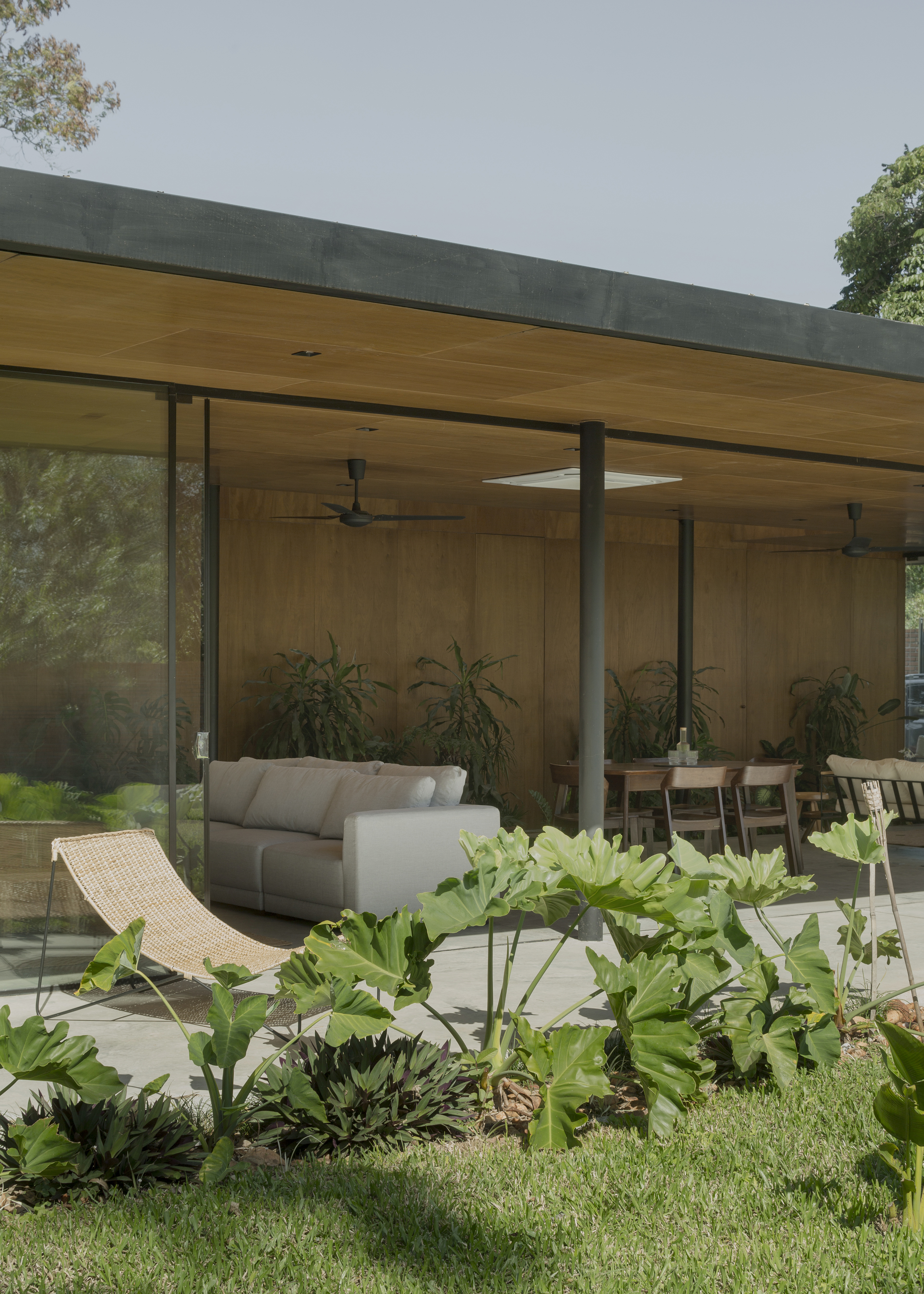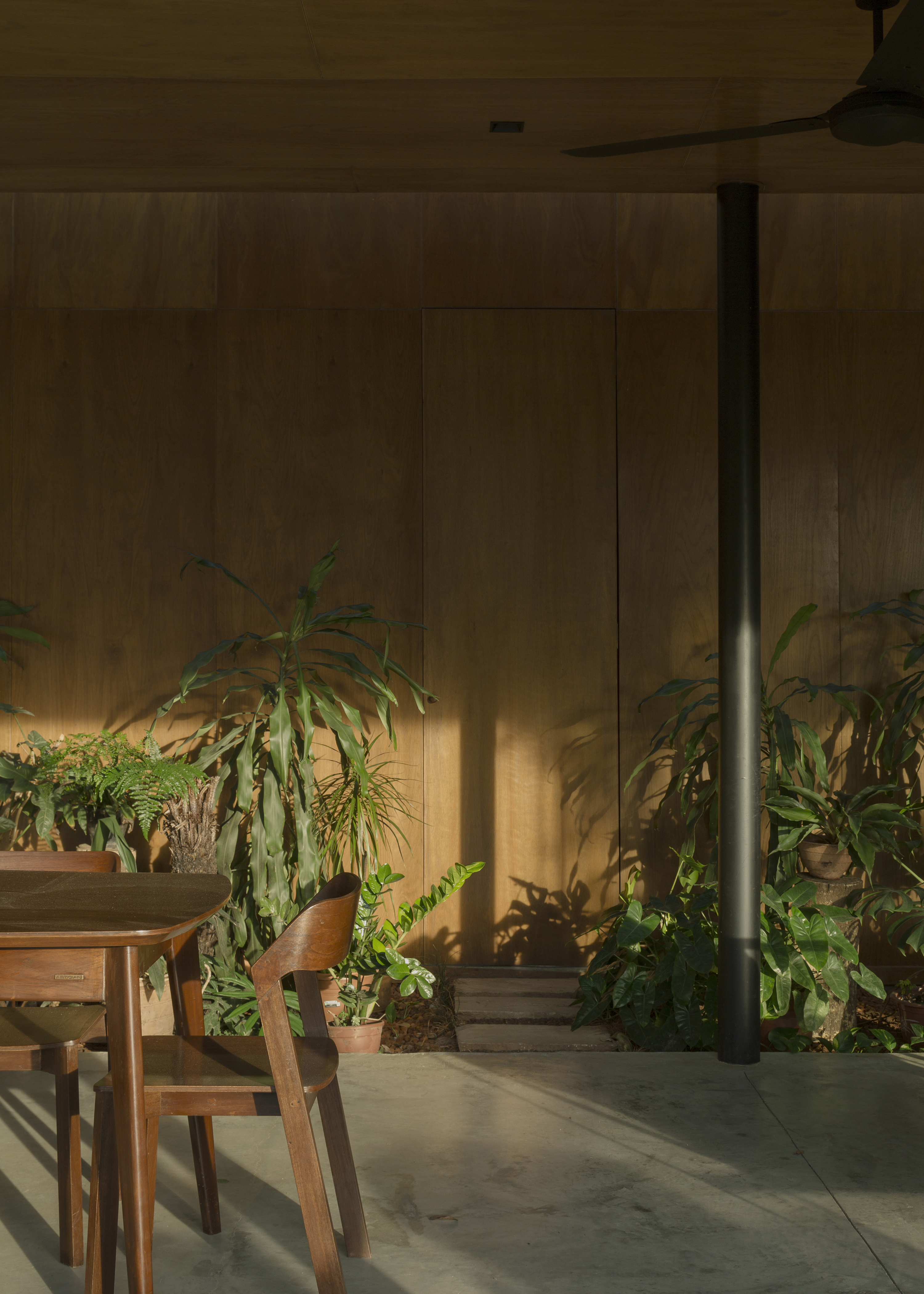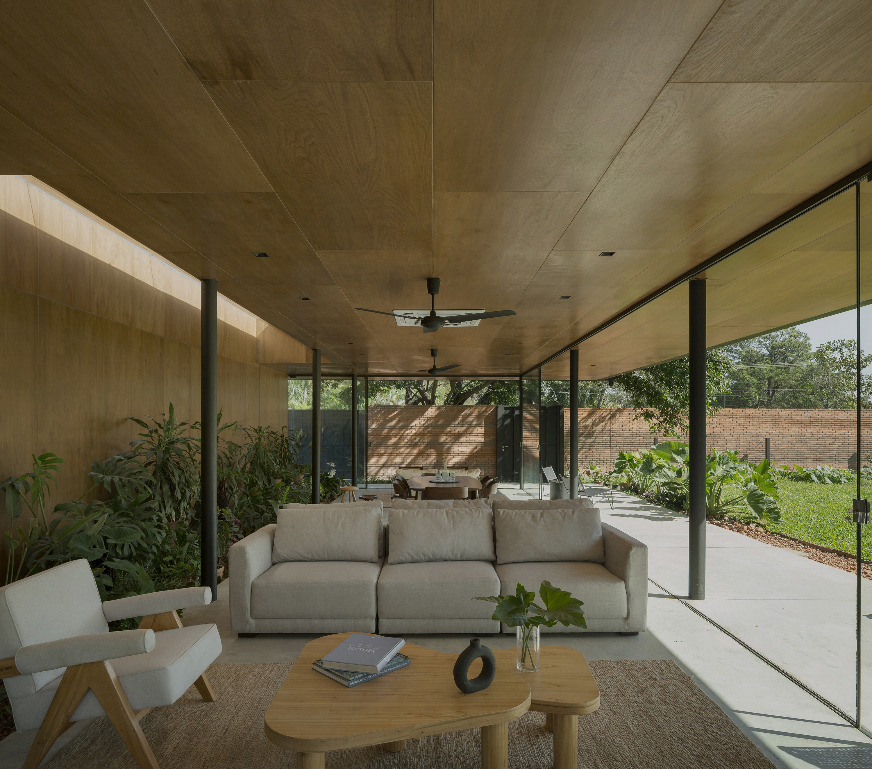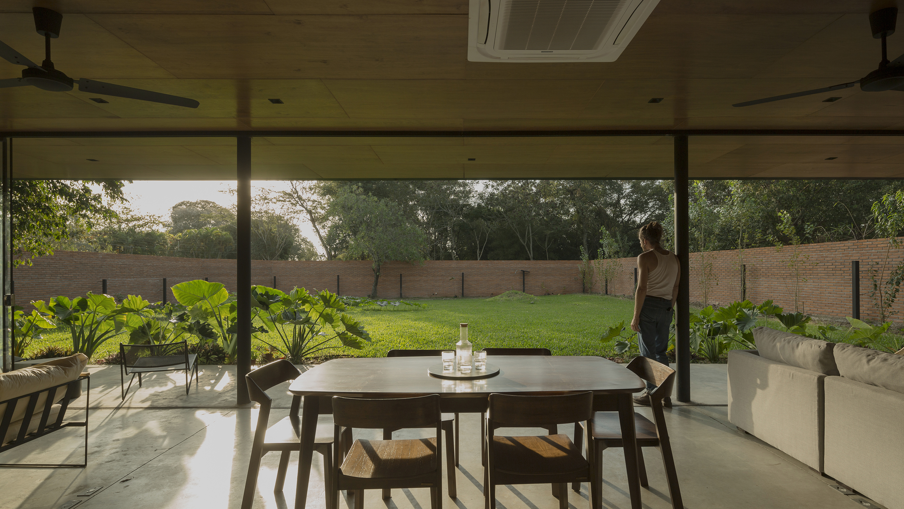 El proyecto se divide en dos sectores, separando los espacios servidos y sirvientes. Por un lado, el gran espacio social, abierto, con conexión al exterior y transformable en un gran espacio intermedio, se convierte en una gran galería de recepción, configurado por aberturas de vidrio y paneles de madera. Separado por un jardín interior está el sector cerrado, privado, donde se ubican los programas de apoyo, como la cocina, los baños, la oficina y el dormitorio, construidos con mampostería de ladrillo.