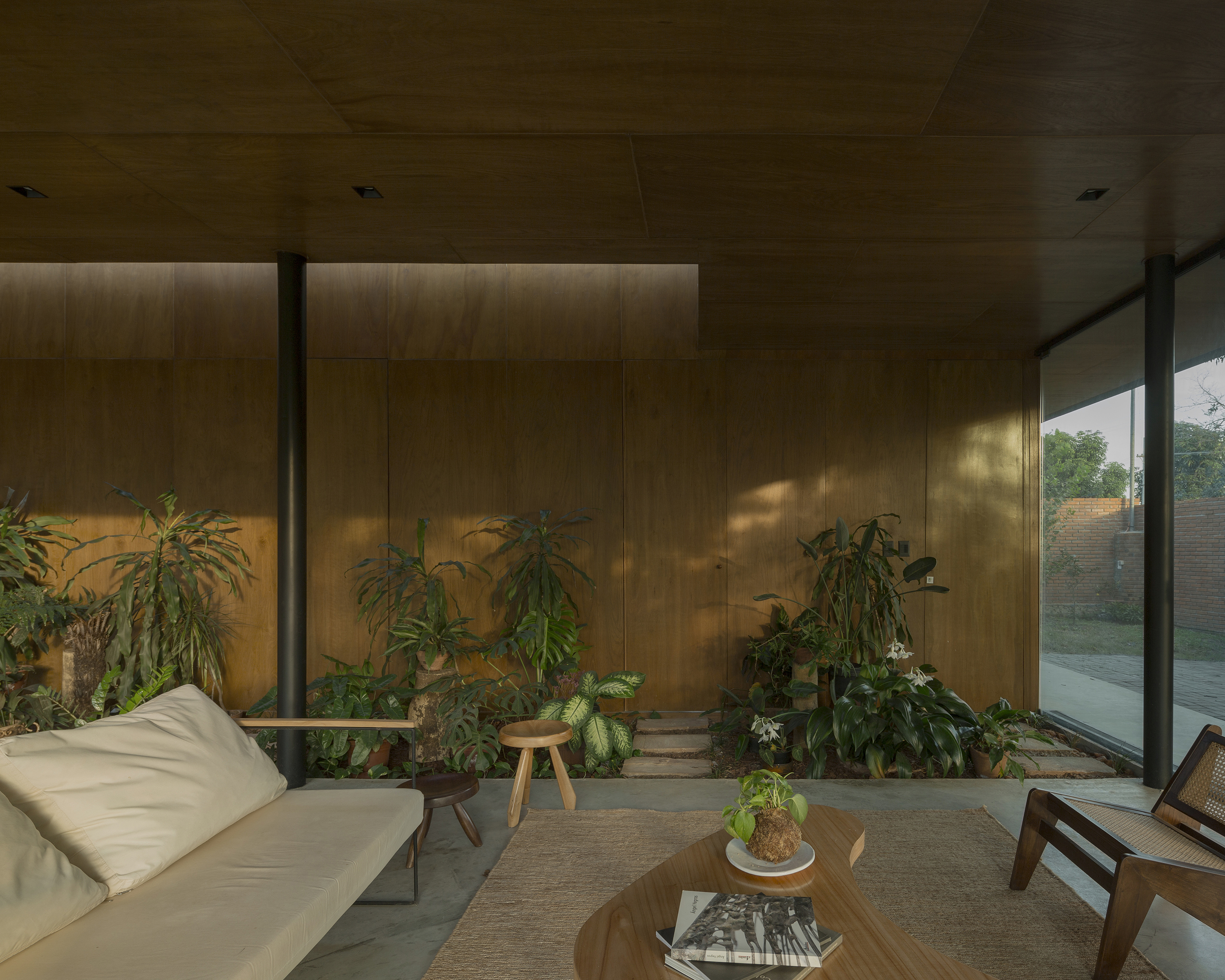 El jardín interior es la pausa y la transición de los dos sectores de la casa. Mediante piedras naturales se marca el camino que representa un cambio de ritmo entre un sector y otro. El tragaluz ubicado encima del jardín se encarga de bañar a las plantas de luz natural y permite observar, siquiera por un momento breve, el cielo desde adentro de la casa. Esta mirilla longitudinal es un observatorio de las nubes y la esfera celeste.